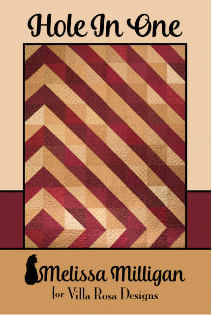 Discover the 'Hole In One' quilt, a stunning piece measuring 56 inches by 70 inches, designed by Melissa Milligan for Villa Rosa Designs. This quilt features a dynamic pattern of diagonal stripes in rich burgundy and warm tan hues, creating a visually striking contrast that adds elegance to any space. The quilt's design showcases a modern yet cozy aesthetic, perfect for both traditional and contemporary settings, making it an ideal choice for enhancing your home decor or as a thoughtful gift.