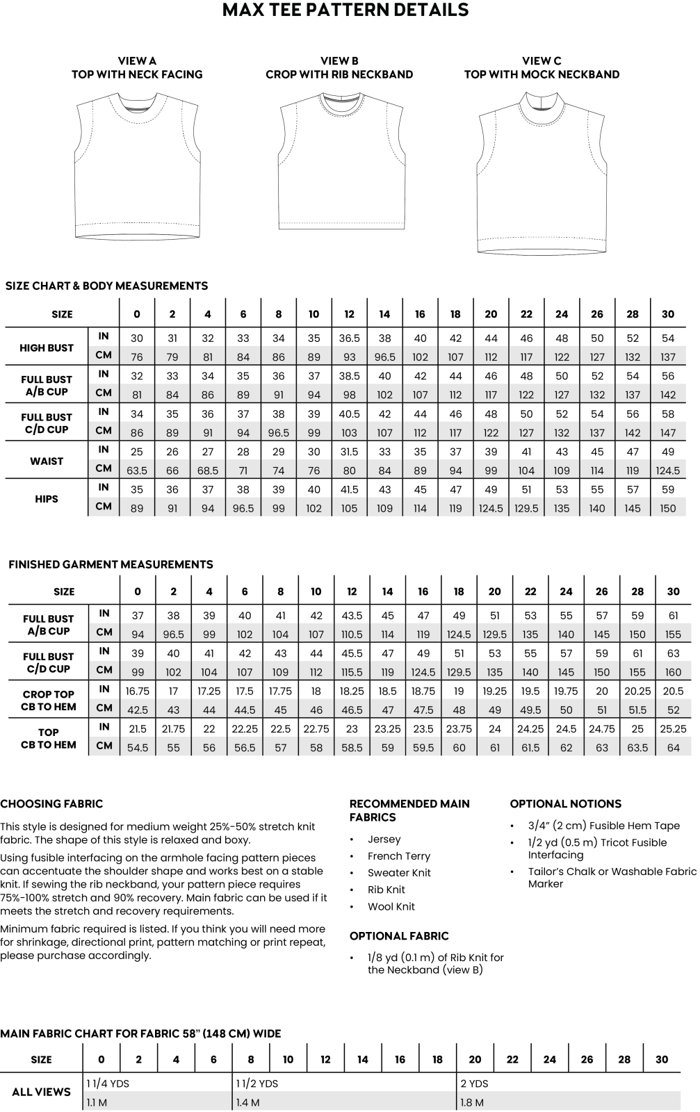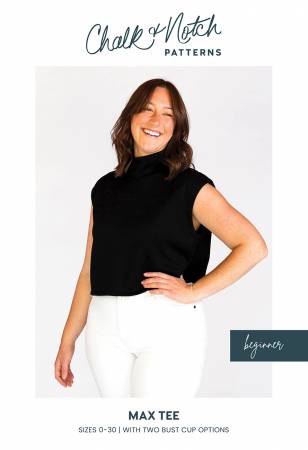 The Max Tee is a boxy knit top with a muscle tee shoulder shape and a dropped armhole. There are two lengths: a cropped tee and a hip length with hem facings. The neckline includes three options: a neck facing, a rib neckband, and a mock neckband.