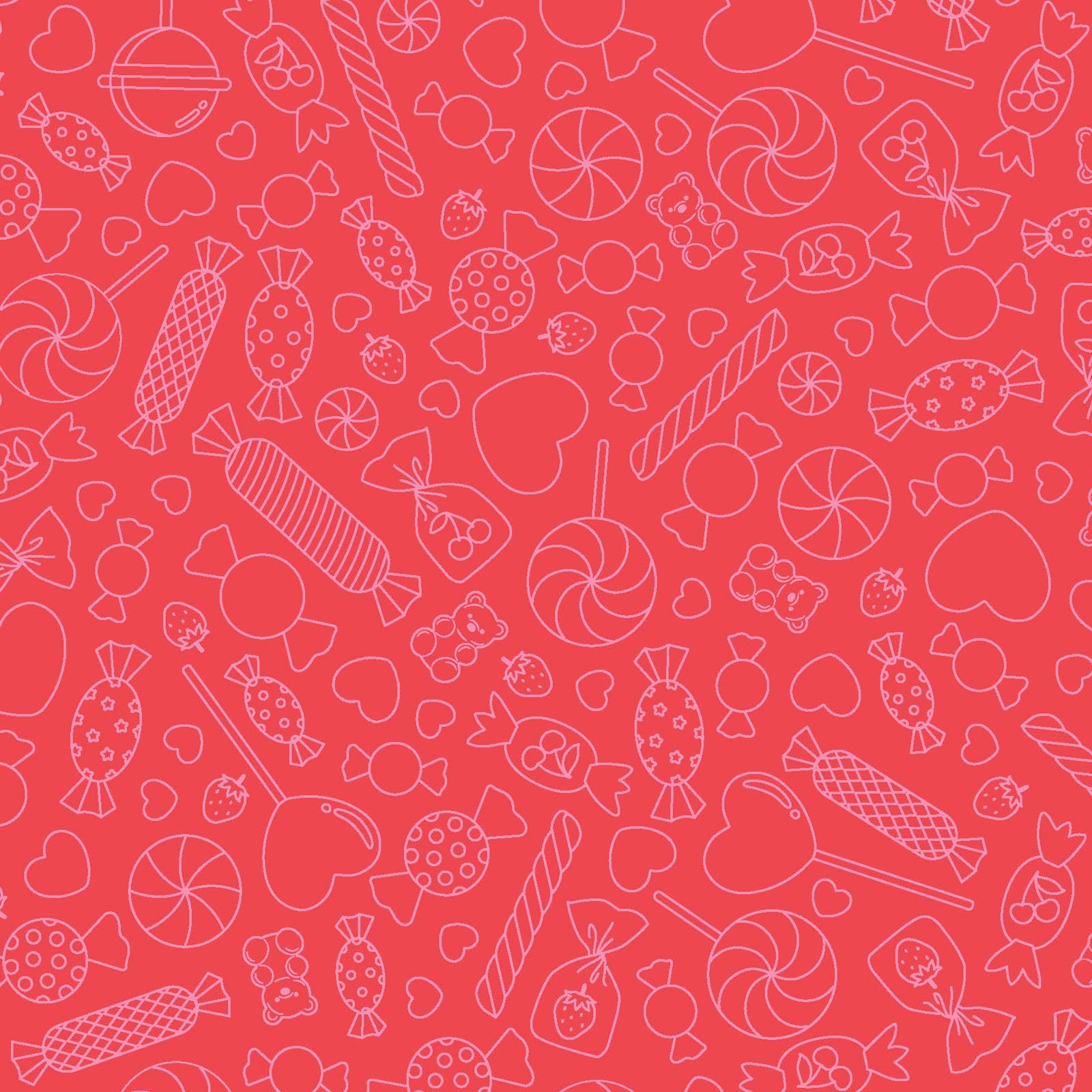 This vibrant fabric features a playful design with various candy-themed elements such as lollipops, candy canes, and hearts, all outlined in white against a bright red background. The pattern is scattered in a whimsical manner, creating a fun and festive look perfect for projects that require a cheerful and sweet aesthetic. Ideal for both B2B and B2C markets, this fabric's lively design can enhance a variety of products from children's clothing to home decor items.